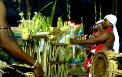 සීයාගේ හඬ තීව්ර වනවාත් සමගම පරල වූ දැරිය පැදුරේ සිට කෙමෙන් කෙමෙන් වෙව්ලමින් පොරවාගෙන සිටි රෙදිකඩ පසෙක ලා දෙපයින් හිටගත්තාය . ඇයගේ ඇඟට වැටී සිටින දිෂ්ටිය දැන් බිල්ල ගැනීමට සූදානම්ය . සීයා පිදේනි තටුවට අත තබාගෙනම නැවතත් පිදේනිය කැප කිරීමට මන්ත්ර මතුරා පිදේනිය කැප ගන්නා තුරු බලාගෙන සිටියේය .
